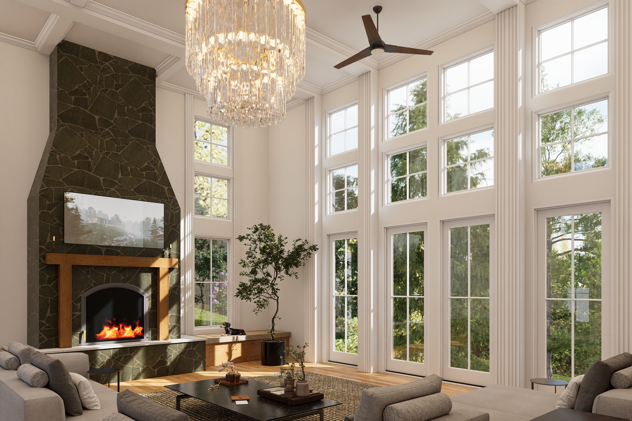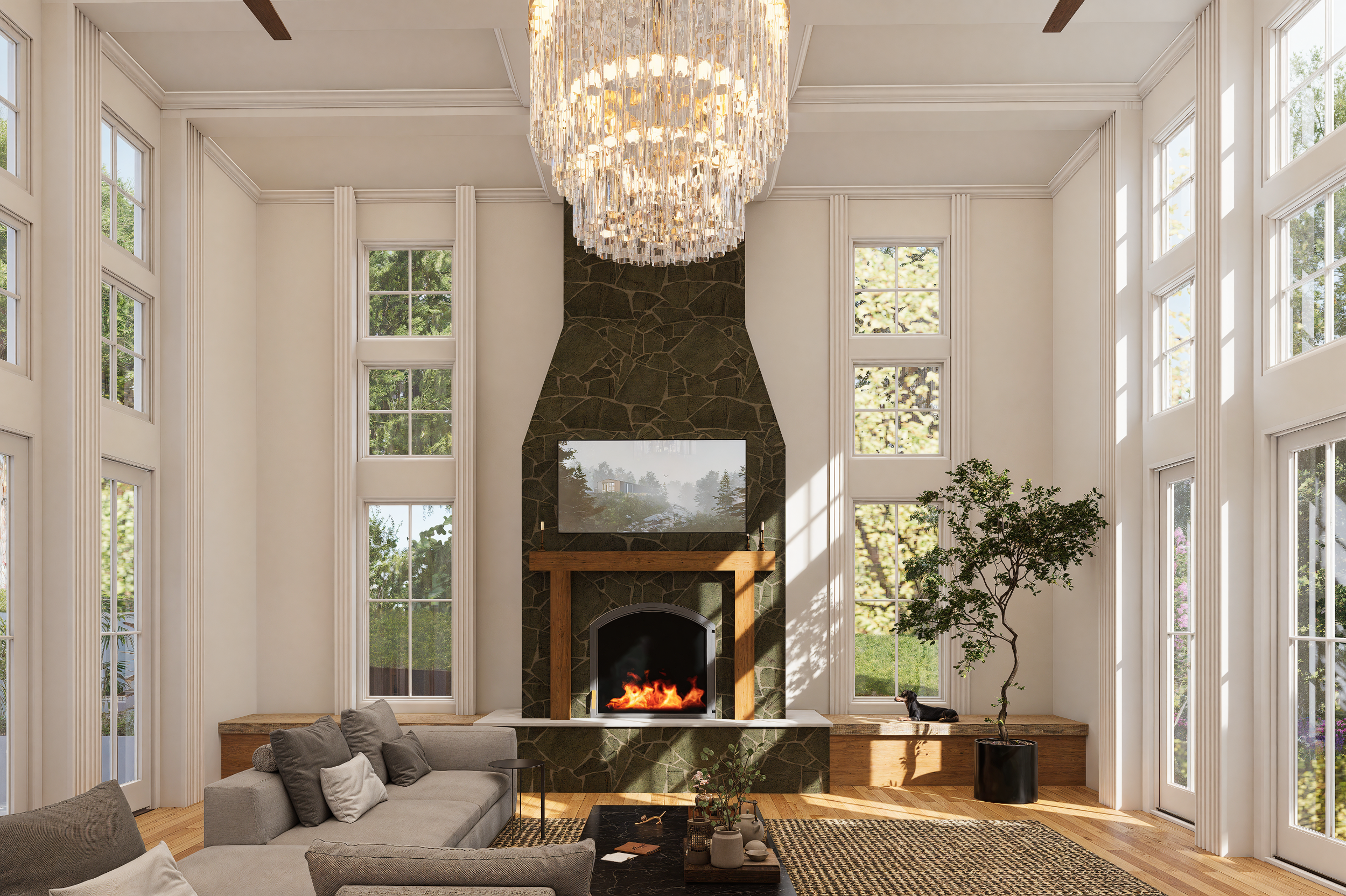 We designed a large-scale addition that transforms the original home while embracing the principles of Georgian architecture. The front elevation was re-centered and extended to create a more balanced and formal presence. The new entry is framed by a front porch with ornate columns and a prominent gable overhead, establishing a clear focal point and enhancing the home's sense of symmetry. On one side of the entry, a new wing includes a two-story library with custom shelving and a quiet upper-level reading loft. On the other side, we introduced a spacious kitchen and dining area on the first floor with a new primary bedroom suite above. A rear addition houses a dramatic double-height family room filled with natural light and anchored by a central fireplace. Traditional materials, window proportions, and classical detailing bring together the expanded footprint into one cohesive and elegant whole.