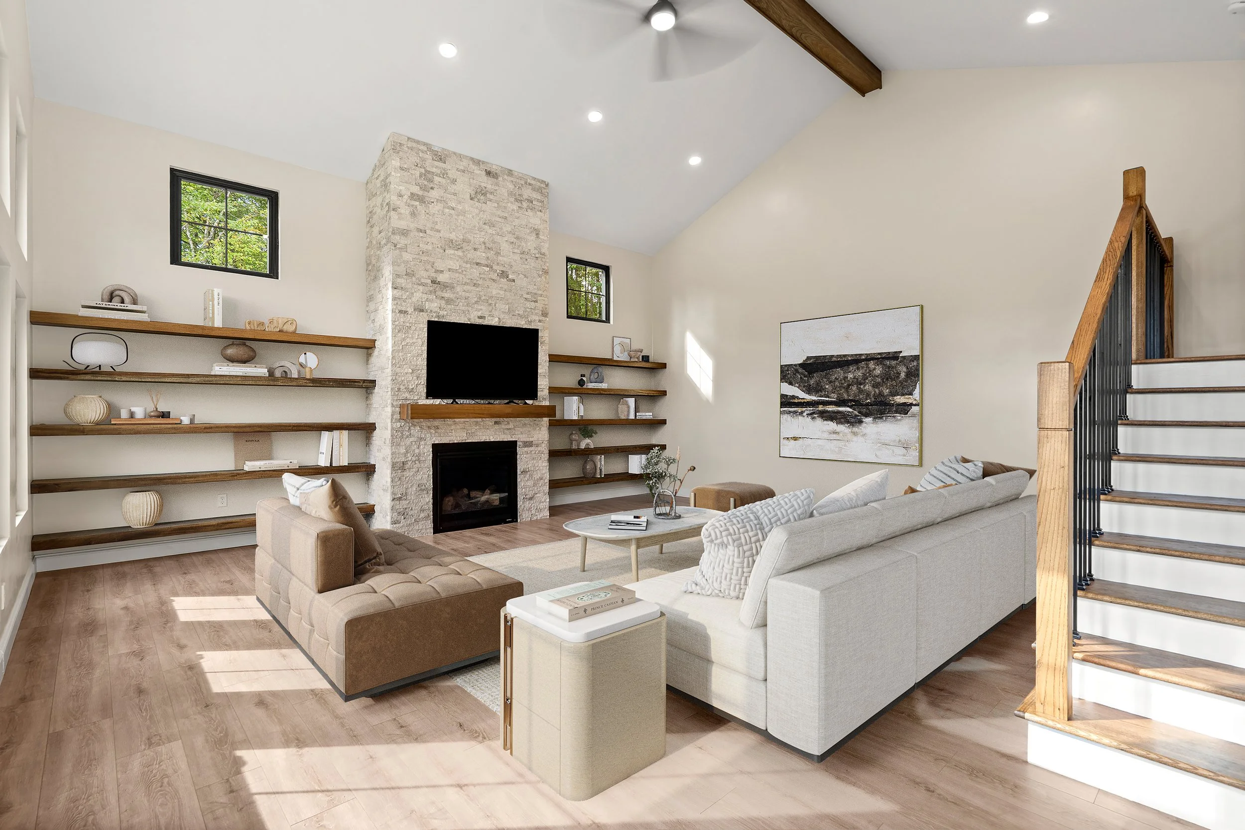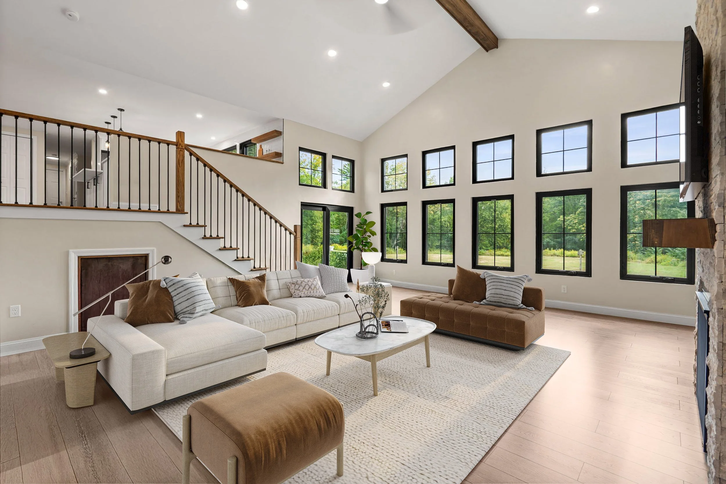 Our design focused on maximizing ceiling height while seamlessly integrating the new spaces with the original structure. We took advantage of the natural grade change on the site and created a large, walk-in living space that sits a few feet below the existing finished floor. This simple move allowed us to achieve nearly 16-foot ceilings without altering the existing roof height, giving the room a sense of volume and openness that was central to the client's vision. The living area is anchored by a large fireplace and framed by a full wall of windows that flood the space with natural light and offer sweeping views of the property. The addition also includes a new open kitchen and dining area, along with a private primary suite, creating a balanced and functional layout tailored to the family's needs