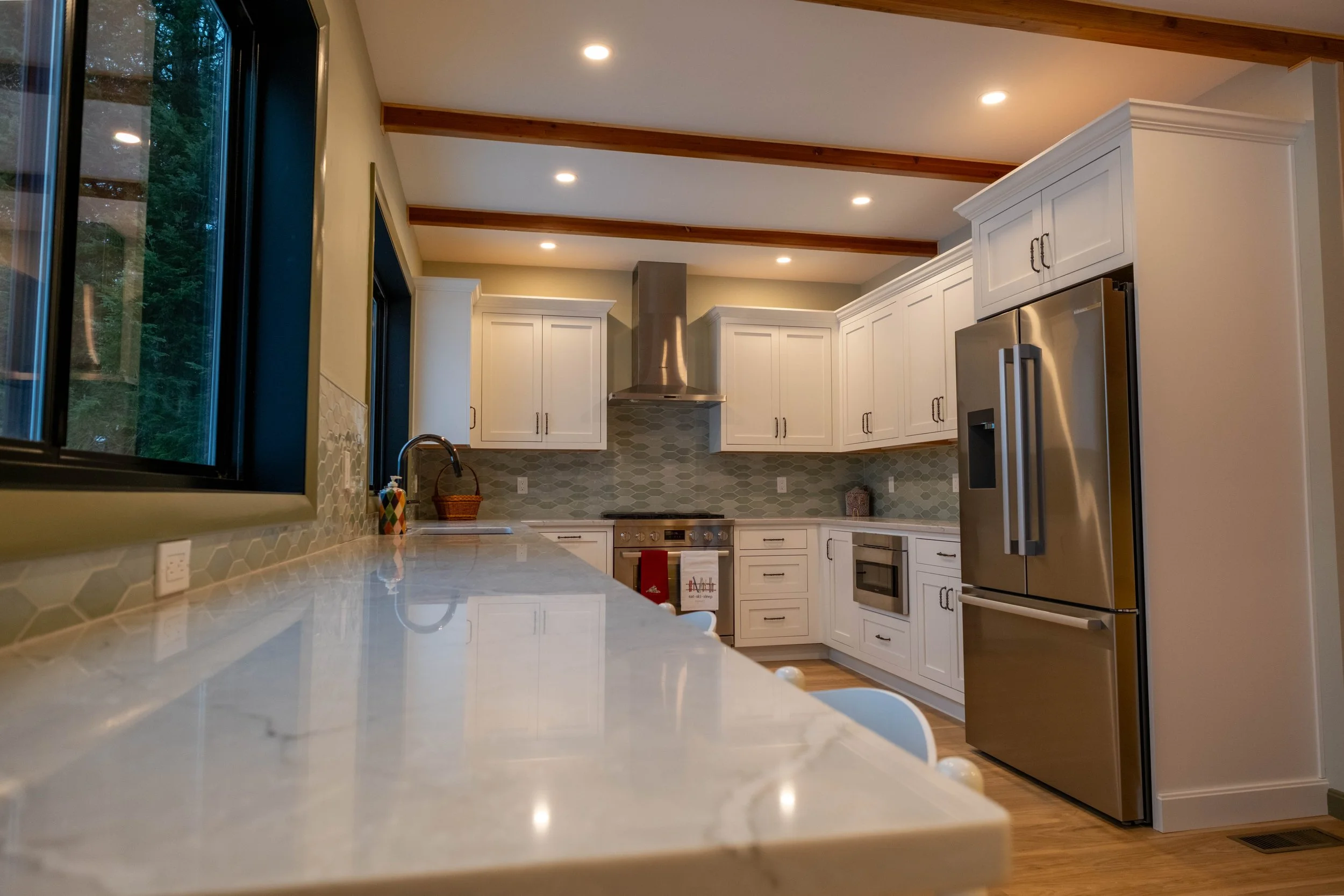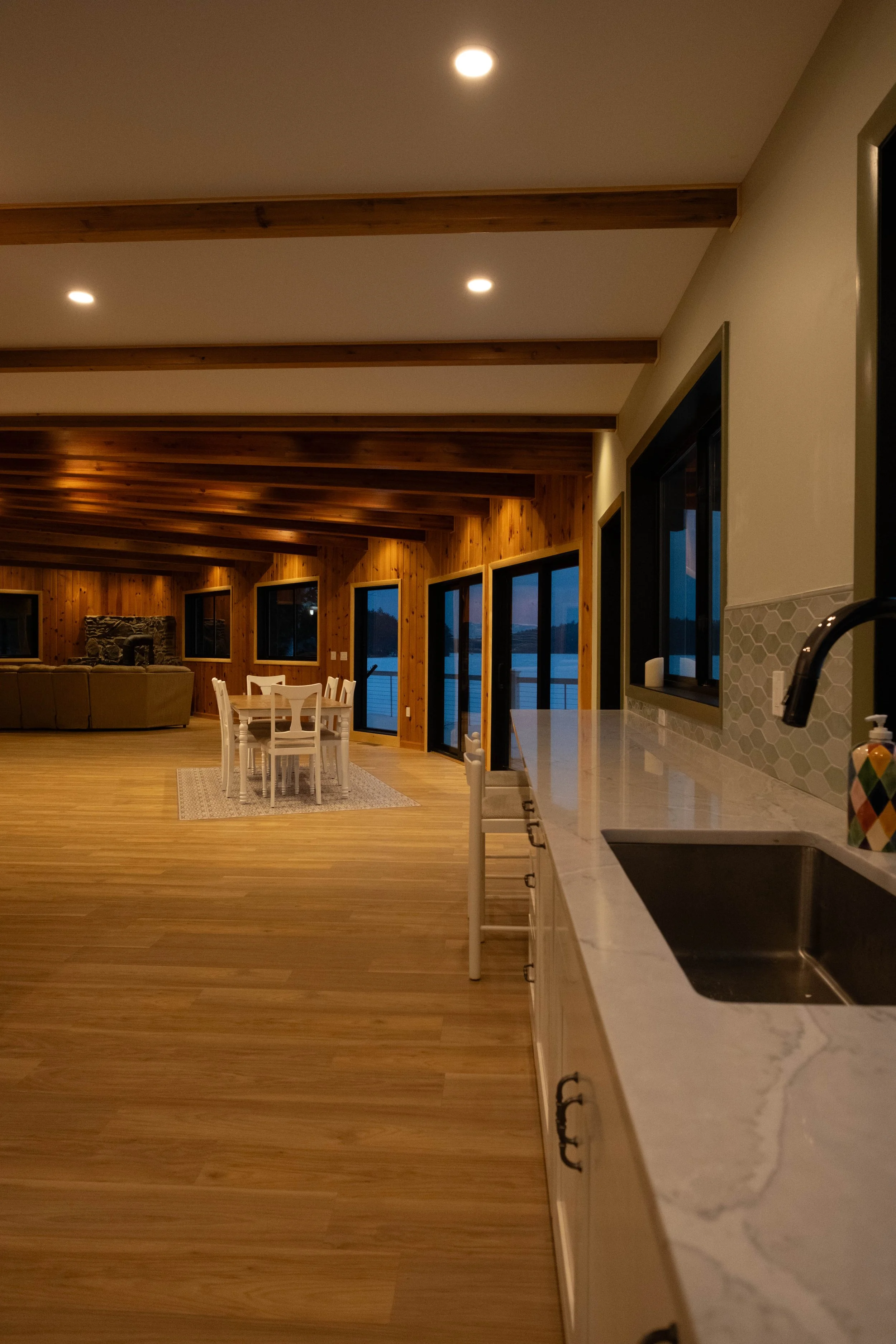 We reconfigured the interior by relocating the kitchen to take full advantage of views toward the lake while establishing a clearer and more intuitive flow throughout the home. This shift allowed us to define distinct yet connected spaces, including a dining area sized to comfortably host the entire family and a living room designed for gathering and relaxation. The new kitchen layout significantly improves functionality, offering better storage, work surfaces, and circulation for meal preparation during busy weekends. Together, these changes transform the home into a cohesive and welcoming retreat that supports hosting, connection, and lakefront living.